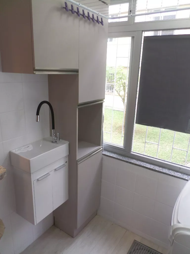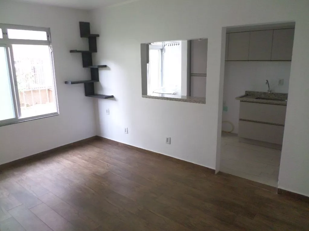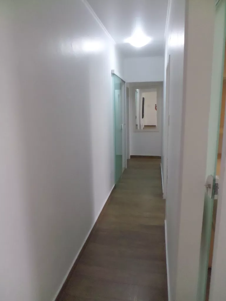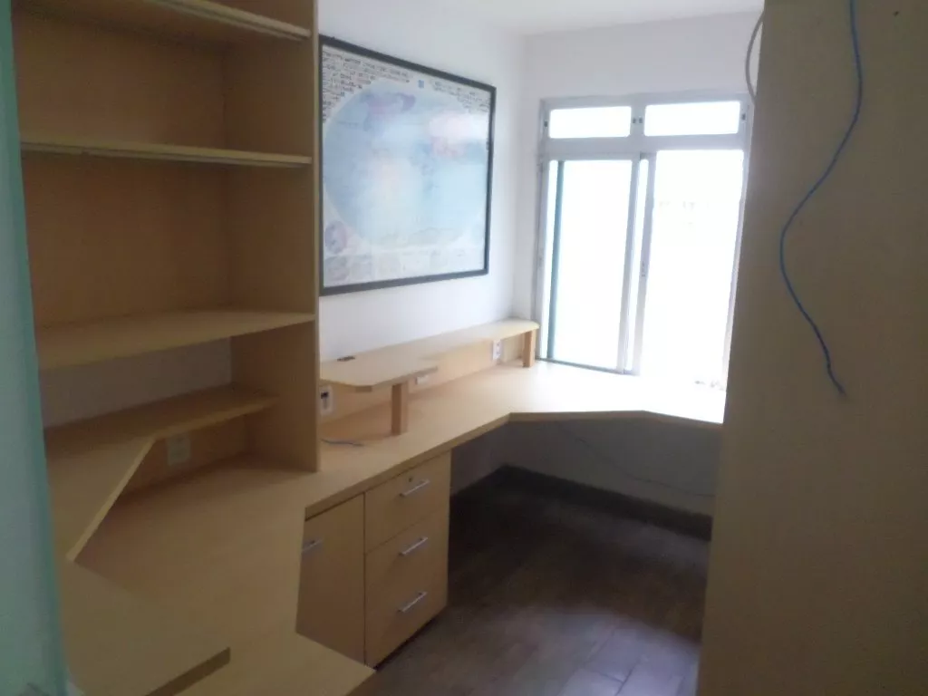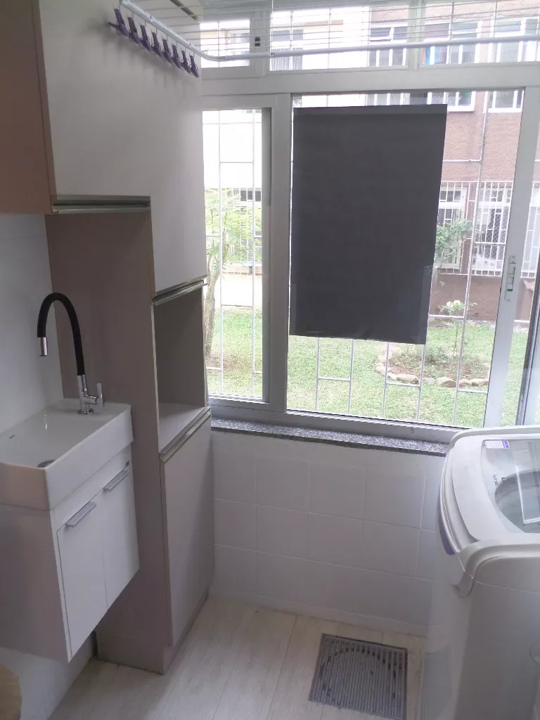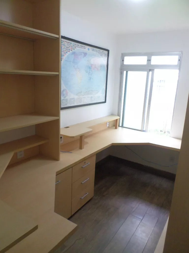 Apartamento de 3 dormitórios com piso laminado, sendo um dormitório adaptado para escritório, banheiro social com pia, espelho e box blindex, sala, cozinha com porcelanato, armários, bancada com duas banquetas, área de serviços com armário, pia e máquina de lavar roupas. Vaga de garagem rotativa.