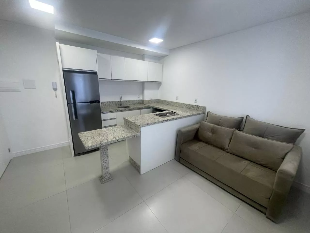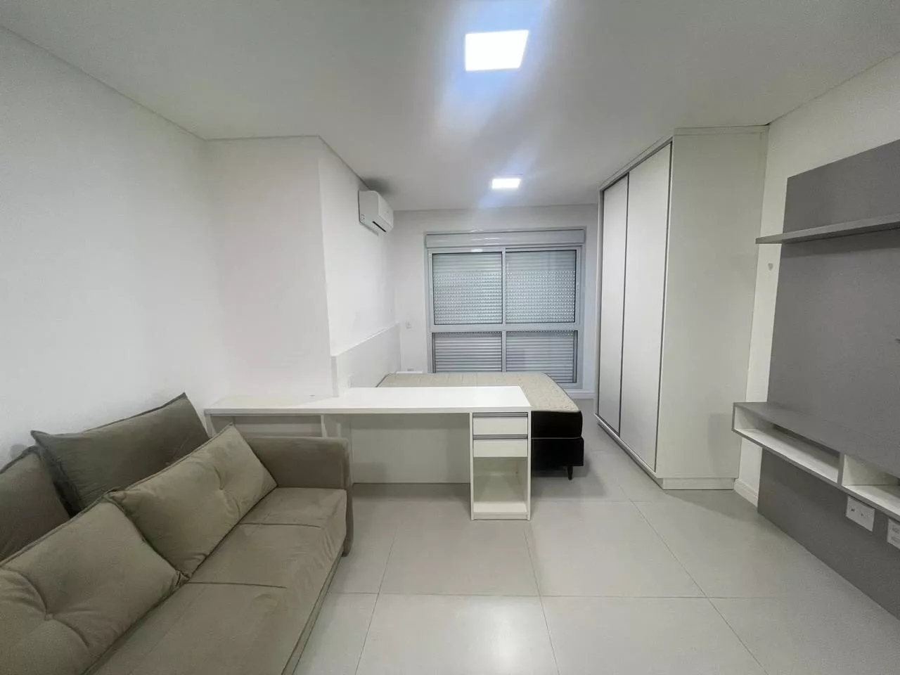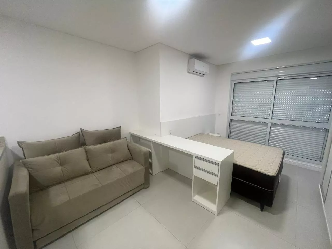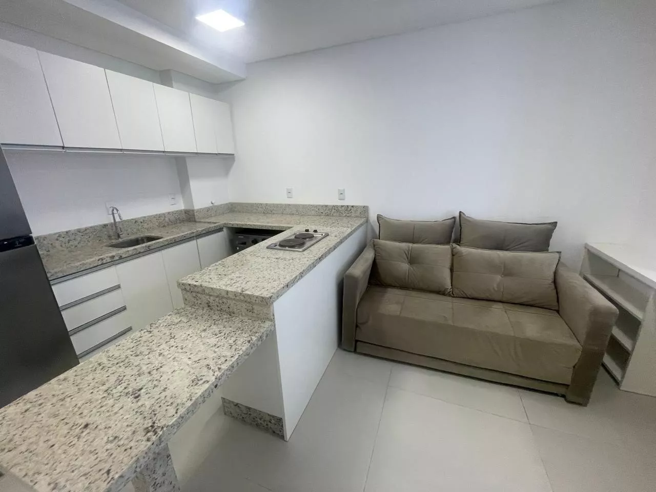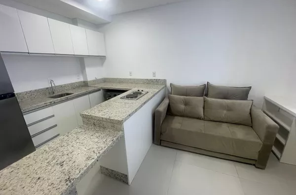 Studio novo, cozinha com armários planejados, cooktop indução, geladeira, micro-ondas, forno elétrico, sala com sofá e mesa com quarto cadeiras, dormitório com armário, cama, ar condicionado split, banheiro com armário, box em vidro, 01 vaga de garagem.