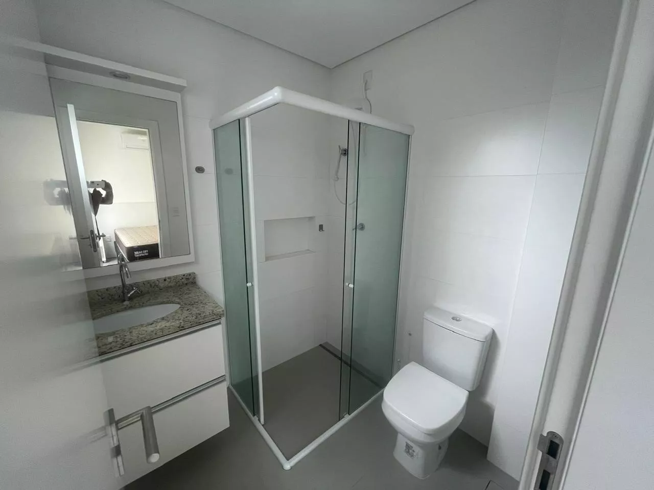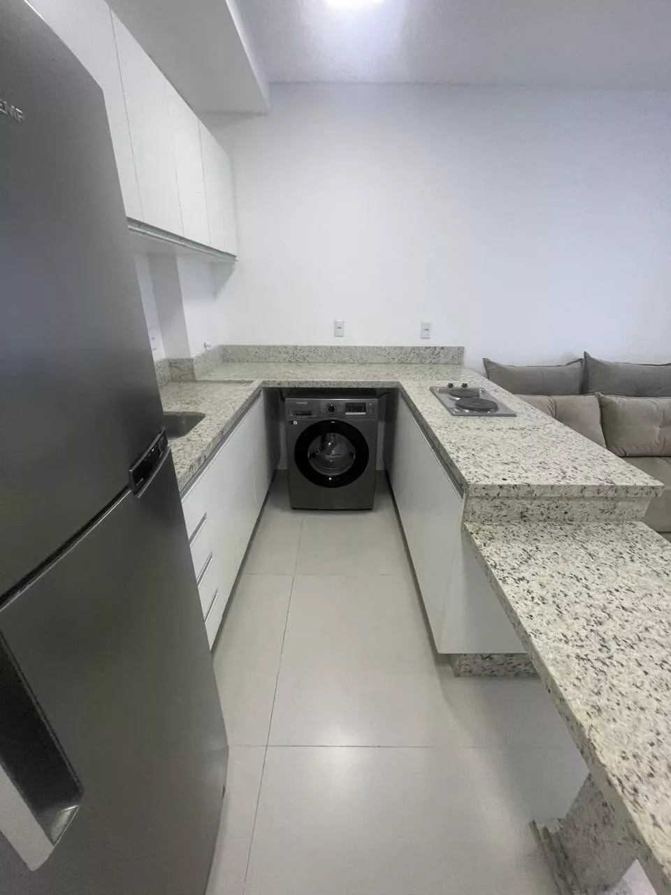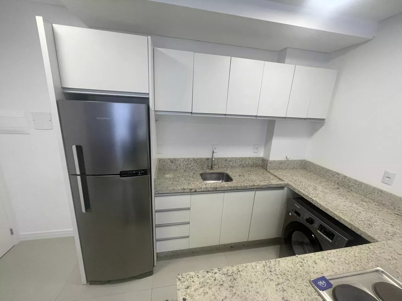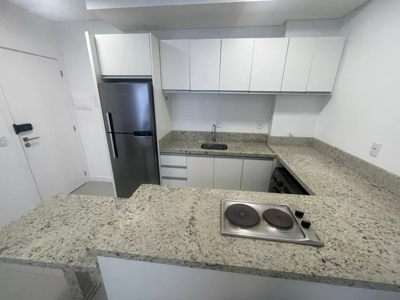 Studio novo, cozinha com armários planejados, cooktop indução, geladeira, micro-ondas, forno elétrico, sala com sofá e mesa com quarto cadeiras, dormitório com armário, cama, ar condicionado split, banheiro com armário, box em vidro, 01 vaga de garagem.