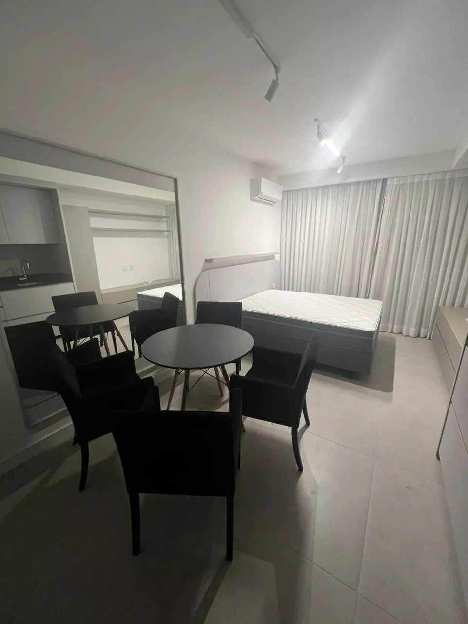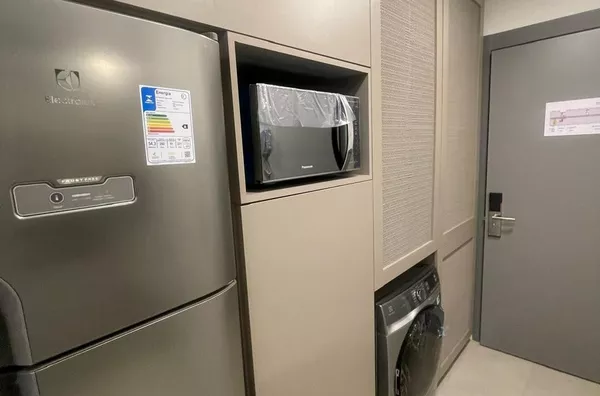 Studio mobiliado, ambiente integrado com sala, quarto e cozinha, piso cerâmico, banheiro com armário, - ar-condicionado split instalado, persianas nas janelas. Sem vaga de garagem