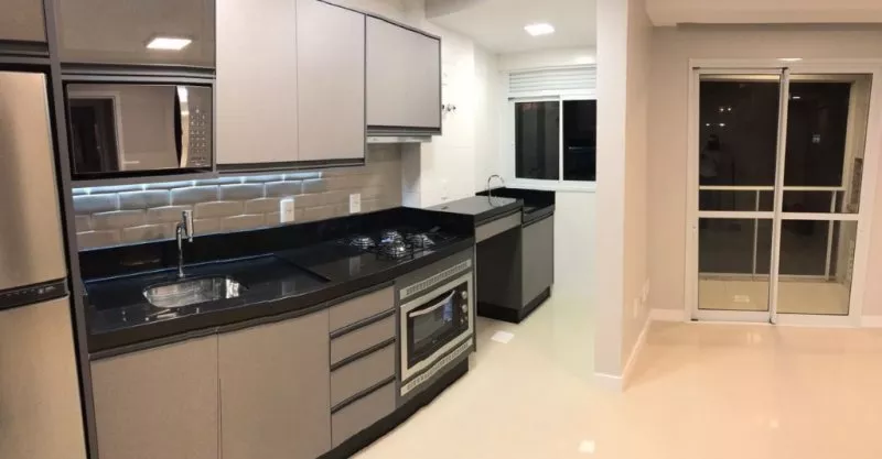 Um dormitório, piso porcelanato, com cozinha planejada contendo: fogão, geladeira, forno elétrico, micro ondas e exaustor.