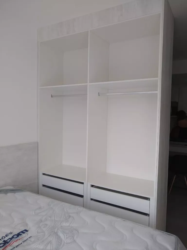 Dormitório separado com armário, cama box, janela com persiana.