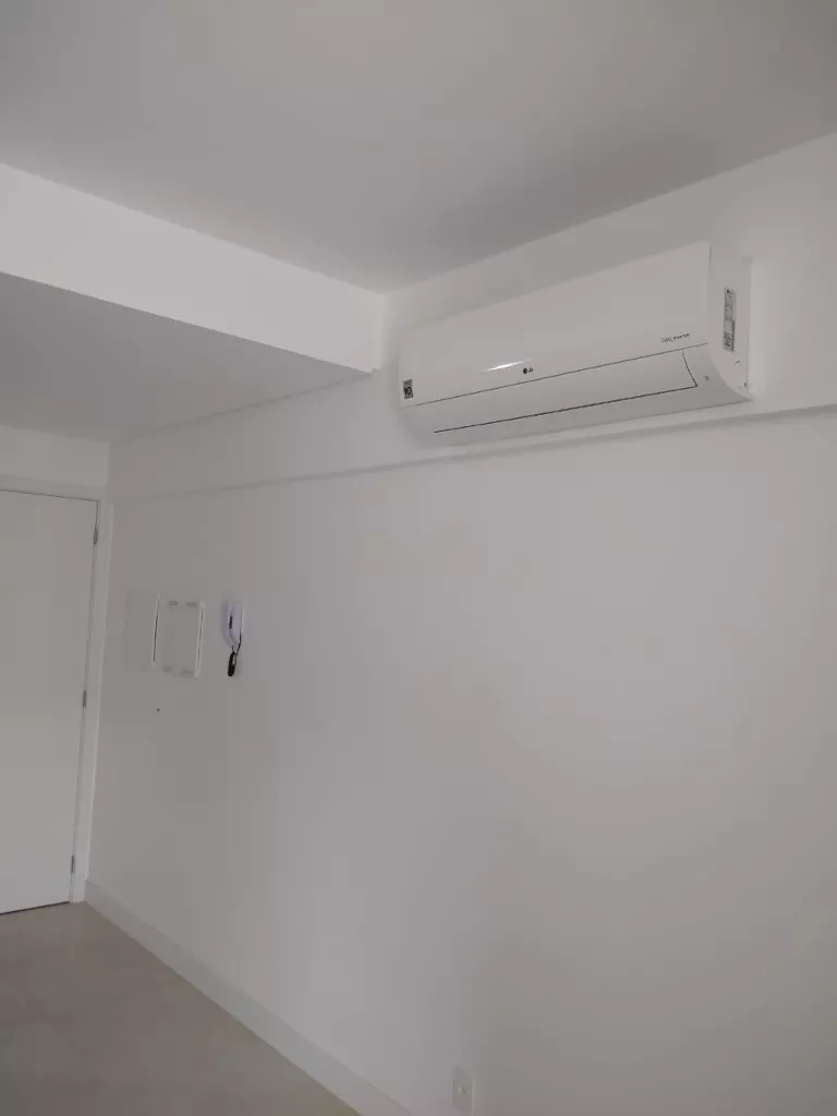 Sala com painel de TV, ar condicionado.