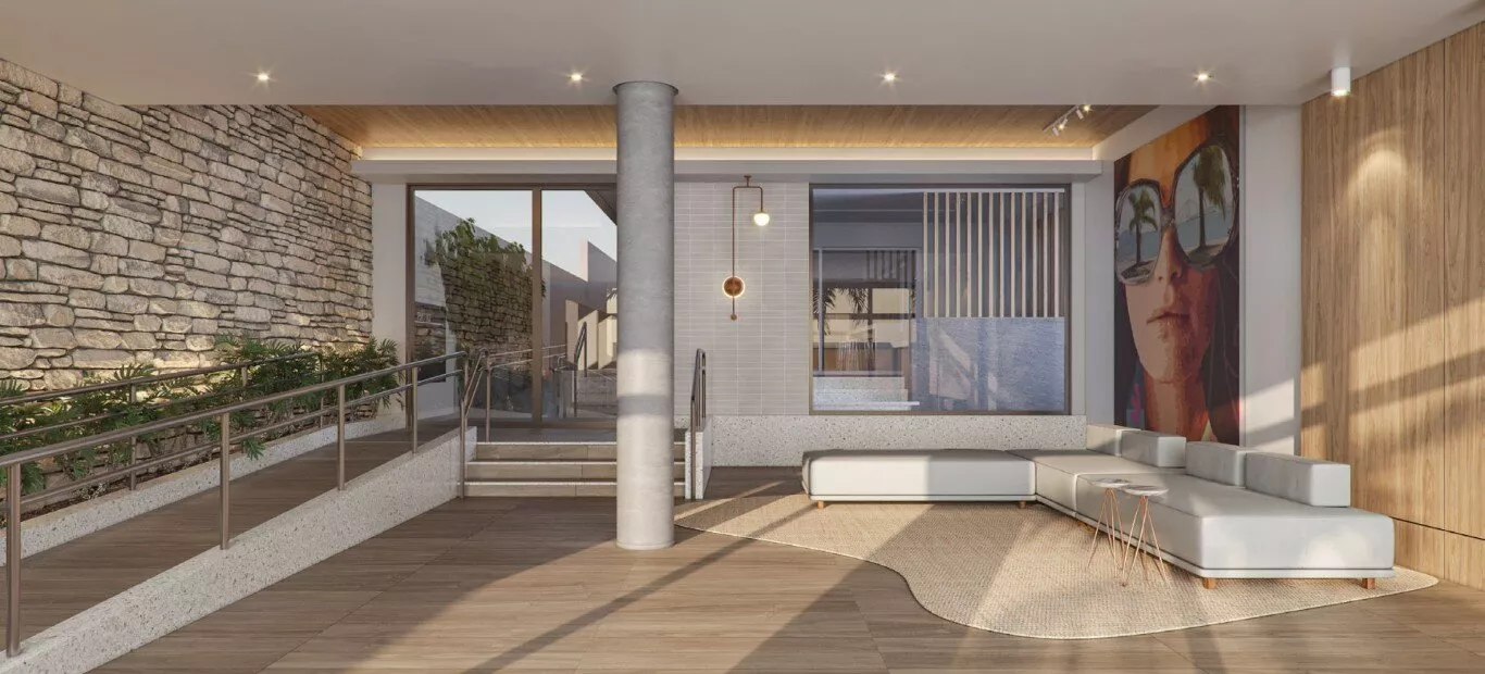 Condomínio possui pórtico de entrada, jardim frontal, espelho d’água. Internamente com portaria, hall, praça aberta coberta,salão de festas, salão de jogos, sanitários feminino, masculino e PNE, depósito, casa de máquinas das piscinas, escada, plataforma elevatória para PNE, rampa de acesso para pedestres, acesso de veículos e espaço lava-tudo, espaço gourmet com varanda coberta, lounge descoberto, piscina adulto, piscina infantil, deck com floreira e ducha para as piscinas, sanitários feminino, masculino e PNE, escada e plataforma elevatória para PNE.