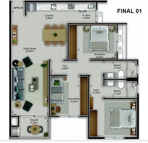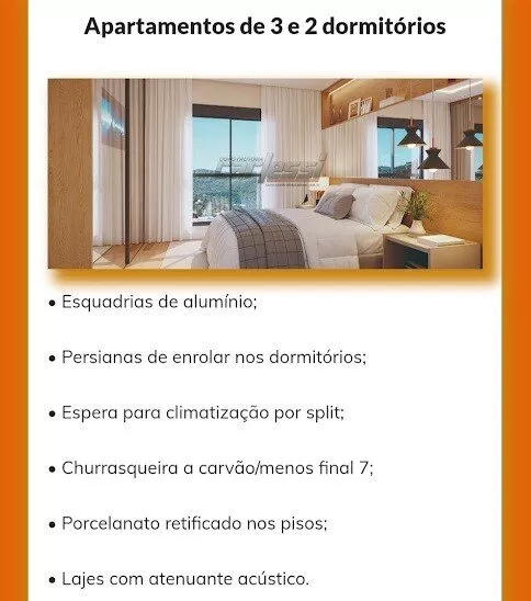 Empreendimento com uma torre com 6 pavimentos (subsolo+ térreo + 5 andares + ático); Apartamentos de 03 dormitórios (1 suíte) e 02 dormitórios (1 suíte); 6 lojas no térreo.