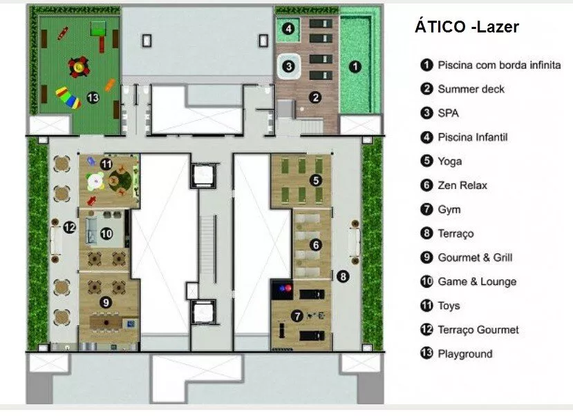 Área de lazer: Piscina; Espaço Gourmet; Espaço fitness; Sala de jogos; Brinquedoteca; Playground; Espaço para yoga.