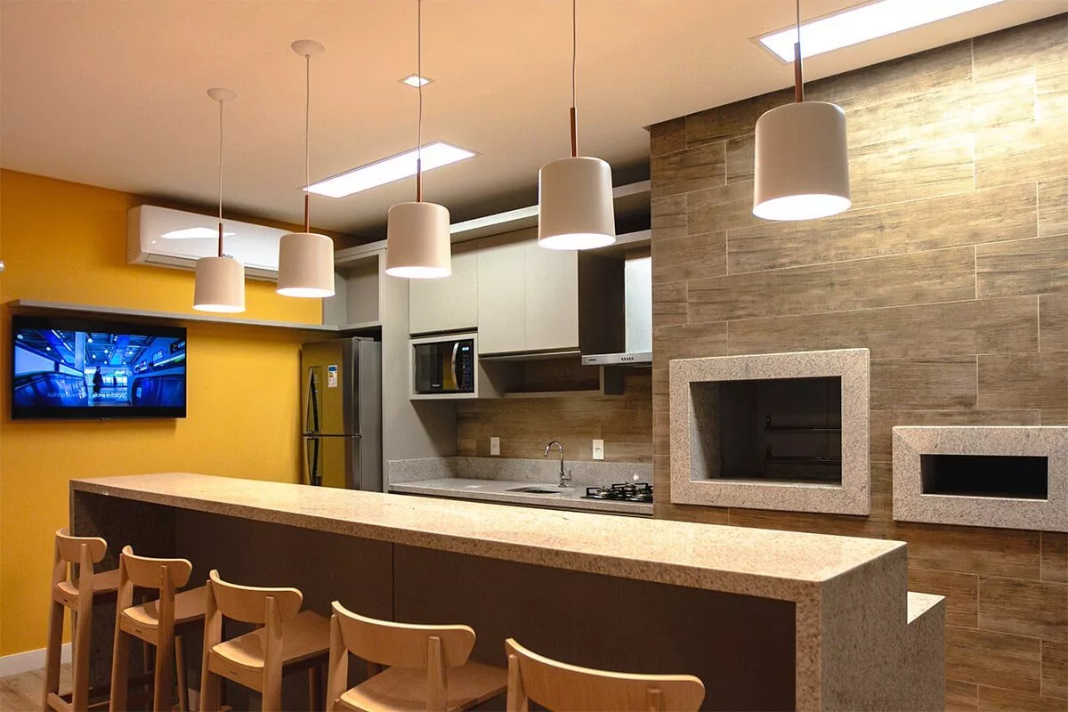 Salão de festas, elevadores, pet place, piscinas adulta e infantil, home cinema, playground, brinquedoteca ,academia, sala de jogos, espaço gourmet, churrasqueira e pizza gourmet.