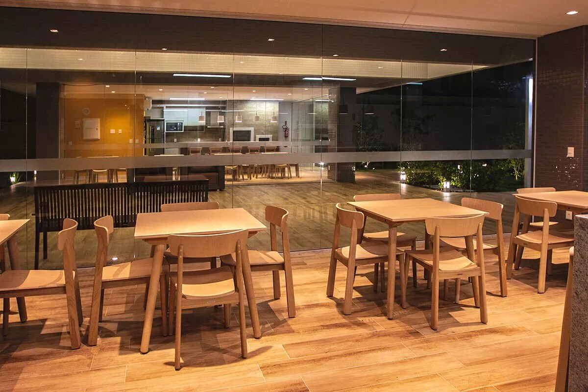 Salão de festas, elevadores, pet place, piscinas adulta e infantil, home cinema, playground, brinquedoteca, academia, sala de jogos, espaço gourmet, churrasqueira e pizza gourmet.
