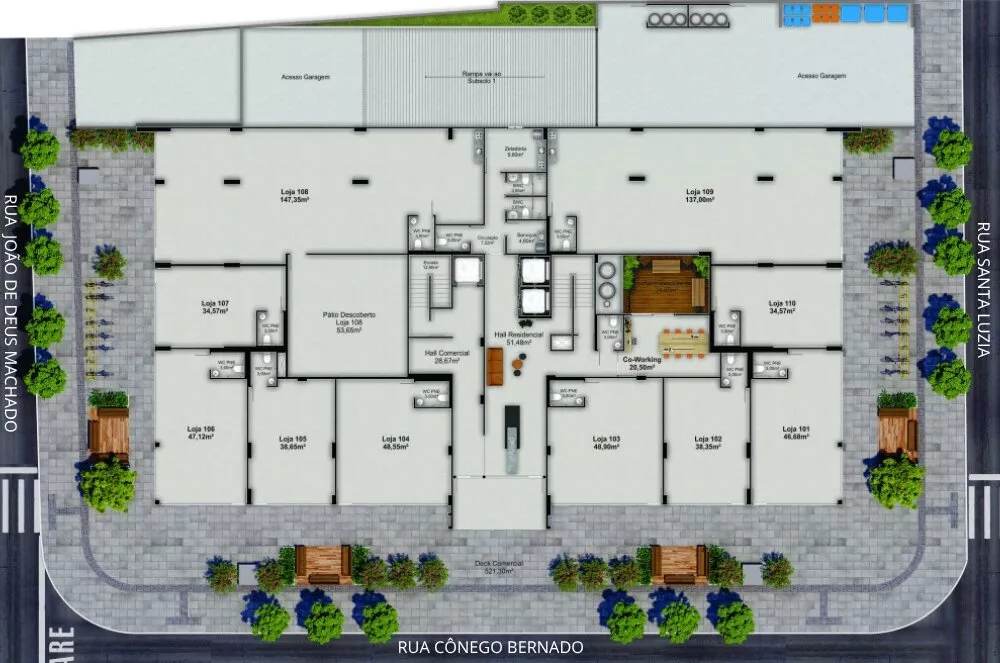 Confira a planta das lojas e perspectivas do empreendimento com os valores de venda de cada uma separadamente, disponibilidade de vaga de garagem privativa para aquisição.