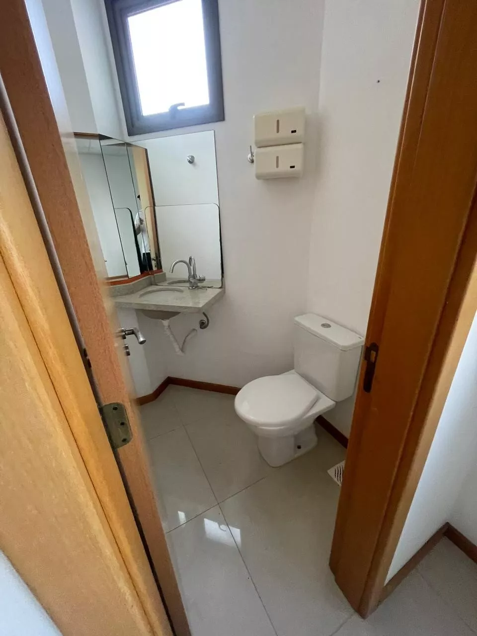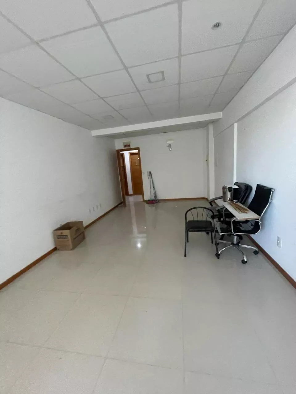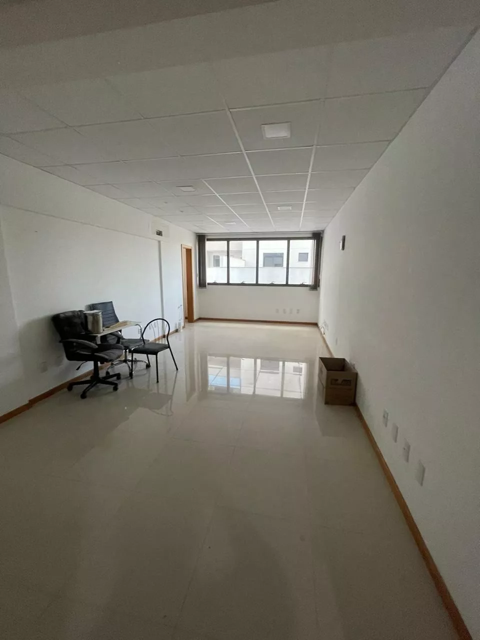 Sala comercial de 34,97 m² de área privativa, piso porcelanato, duas esperas para ar-condicionado tipo Split e banheiro.